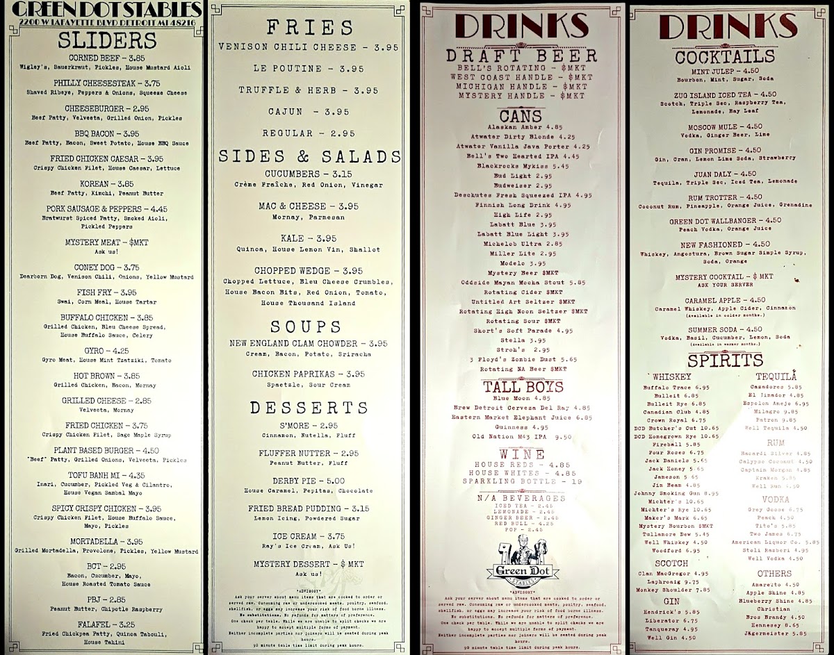 Welcome to Green Dot Stables, a hidden gem located at 2200 W Lafayette Blvd, Detroit, MI. This vibrant spot offers a unique dining experience that combines affordable prices with a fun, laid-back atmosphere. With sliders priced at just $4.50 each, this is the perfect place for food enthusiasts looking to sample a variety of flavors without emptying their wallets.